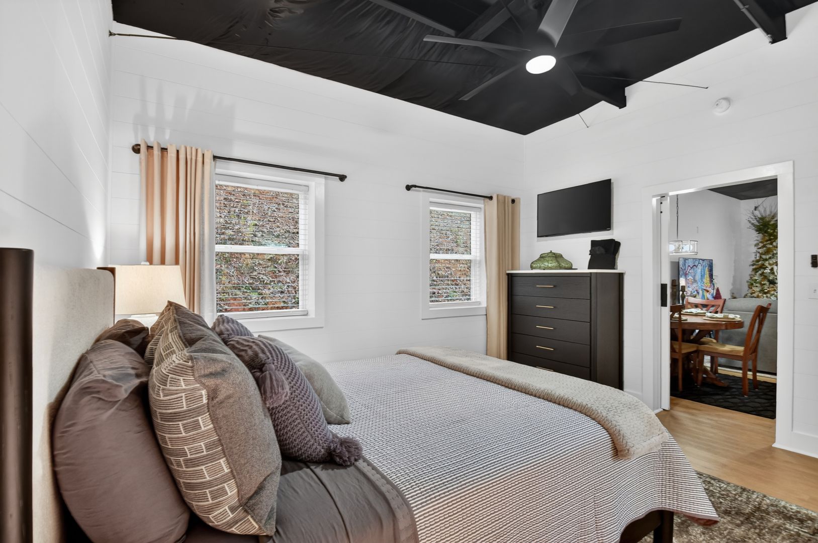 The bedroom features a comfy queen bed with a wall mounted smart tv. Extra pillows, blankets & throws for your comfort and convenience. Also equipped with a ceiling fan