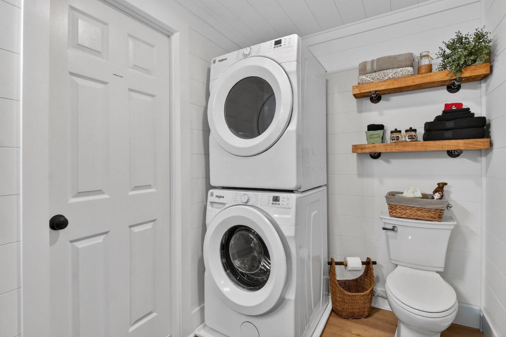 Full size bathroom with shower/tub combo. Shampoo, conditioner & body wash provided. Also full size washer/dryer with laundry detergent provided. Lots of fluffy towels and a hair dryer provided as well.